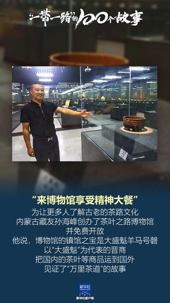 “来博物馆享受精神大餐。”为让更多人了解古老的茶路文化,内蒙古藏友孙海峰创办了茶叶之路博物馆,并免费开放。他说,博物馆的镇馆之宝是大盛魁羊马号磬,以“大盛魁”为代表的晋商,把国内的茶叶等商品运到国外,见证了“万里茶道”的故事。(记者:赵泽辉)