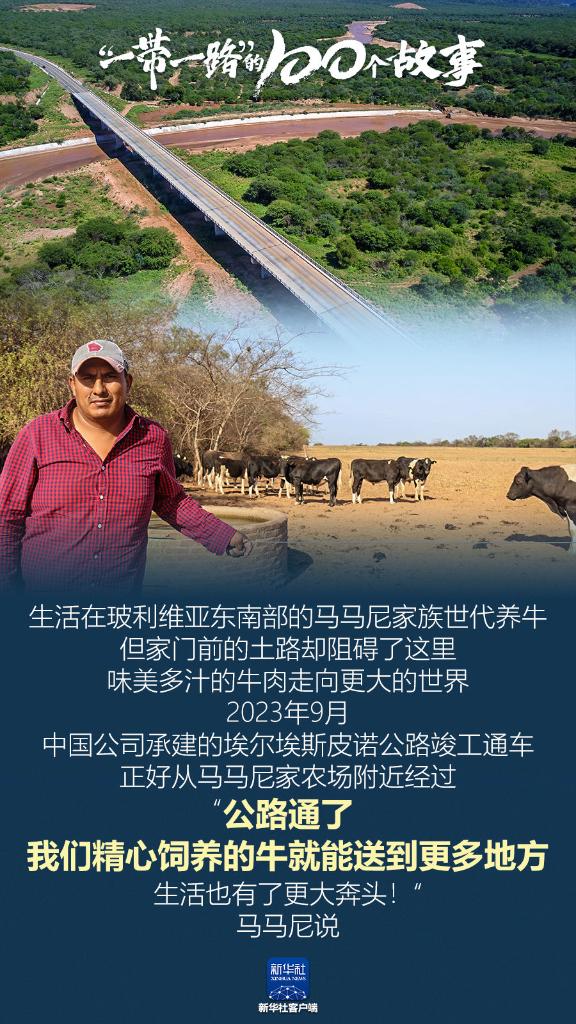 生活在玻利维亚东南部的马马尼家族世代养牛,但家门前的土路却阻碍了这里味美多汁的牛肉走向更大的世界。2023年9月,中国公司承建的埃尔埃斯皮诺公路竣工通车,正好从马马尼家农场附近经过。“公路通了,我们精心饲养的牛就能送到更多地方,生活也有了更大奔头!”马马尼说。(记者:郝云甫、吴昊)