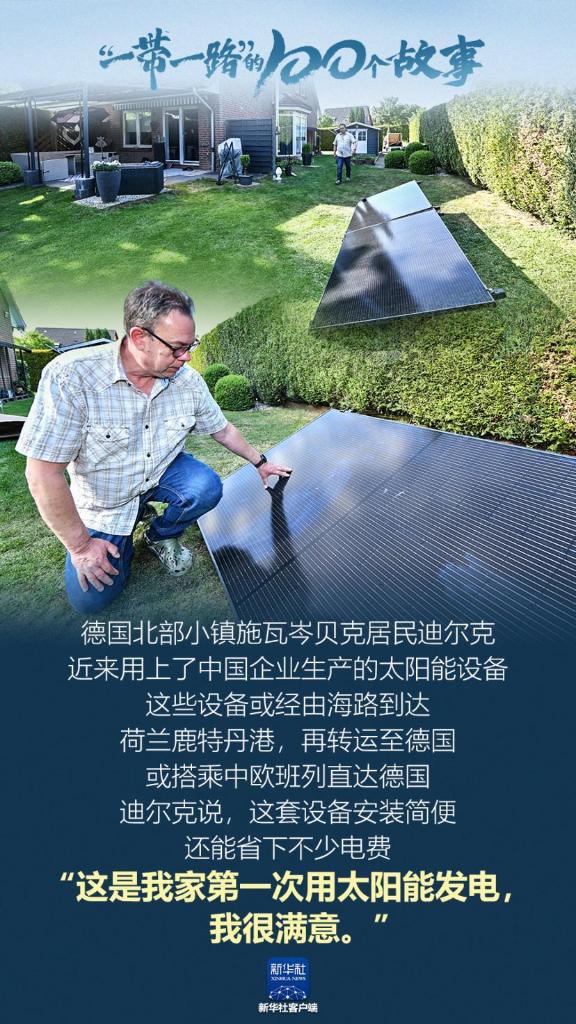 德国北部小镇施瓦岑贝克居民迪尔克,近来用上了中国企业生产的太阳能设备。这些设备或经由海路到达荷兰鹿特丹港,再转运至德国,或搭乘中欧班列直达德国。迪尔克说,这套设备安装简便,还能省下不少电费,“这是我家第一次用太阳能发电,我很满意”。(记者:任鹏飞)