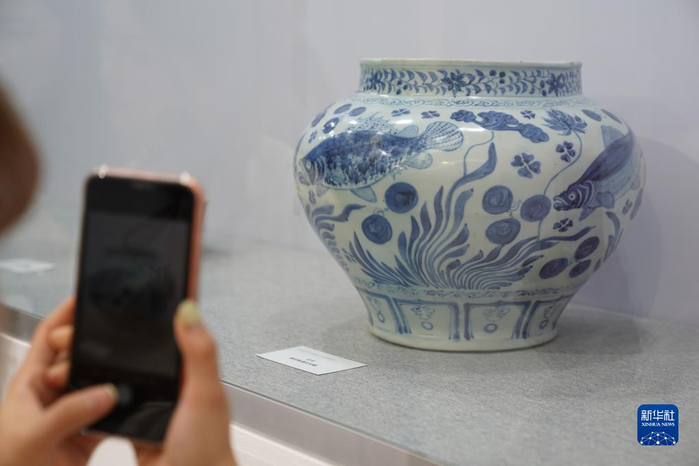 10月18日,参观者在瓷博会现场举办的第六届世界华人收藏家大会瓷器精品展上拍摄展品。