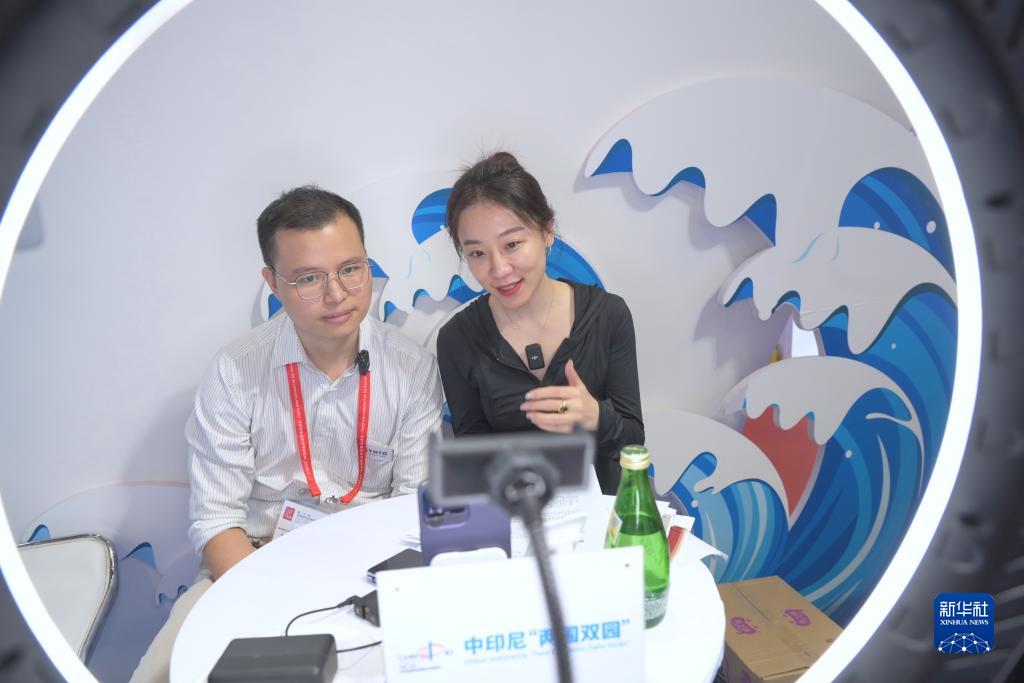 工作人员在第二十三届中国国际投资贸易洽谈会中印尼“两国双园”展位开展直播活动(9月9日摄)。