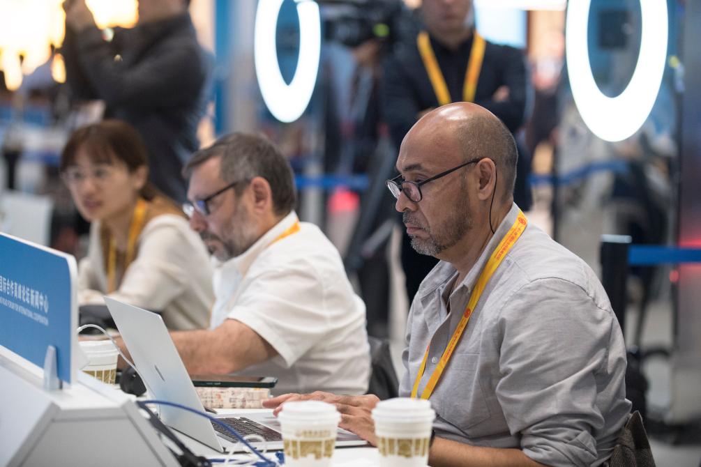 10月17日,记者在“一带一路”国际合作高峰论坛新闻中心工作。新华社记者 张豪夫 摄