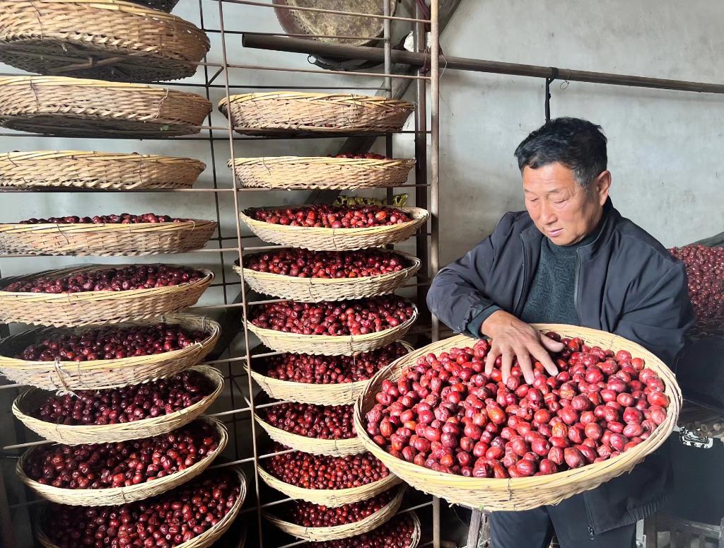 10月12日,在山西省稷山县陶梁村,枣农郅平威在家中晾晒板枣。新华社记者 柴婷 摄