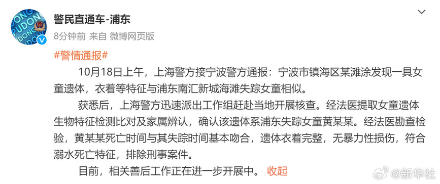 10月18日上午,上海警方接宁波警方通报:宁波市镇海区某滩涂发现一具女童遗体,衣着等特征与浦东南汇新城海滩失踪女童相似。