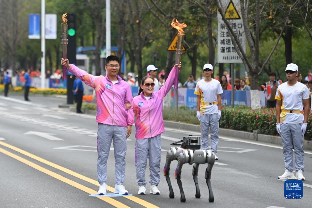 10月19日,火炬手叶昌炜(左)、蔡琼卉在火炬传递中。