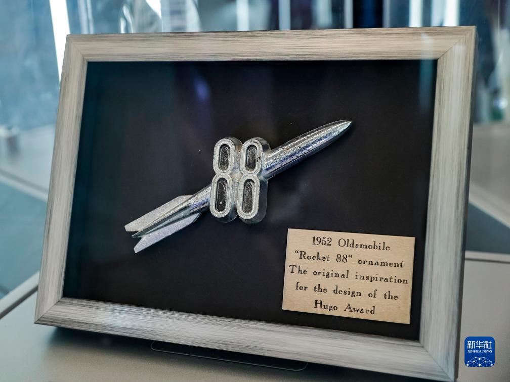 这是10月18日在2023成都世界科幻大会主题展览上拍摄的1952奥兹莫比尔“火箭88”汽车装饰品。