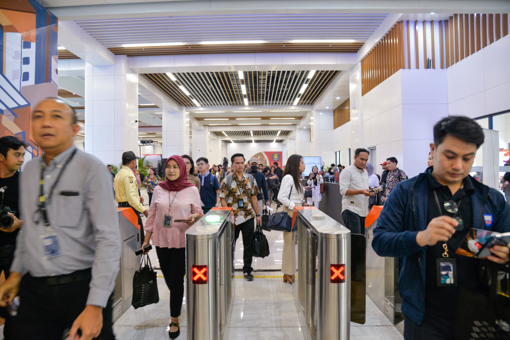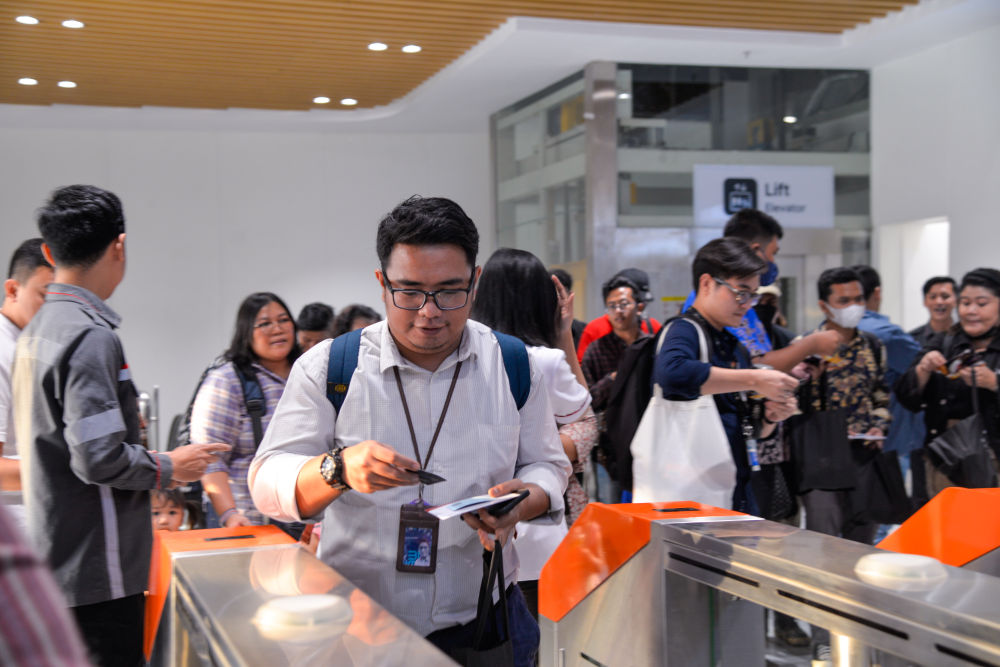 10月17日,在印度尼西亚万隆德卡鲁尔站,乘客刷票出站。