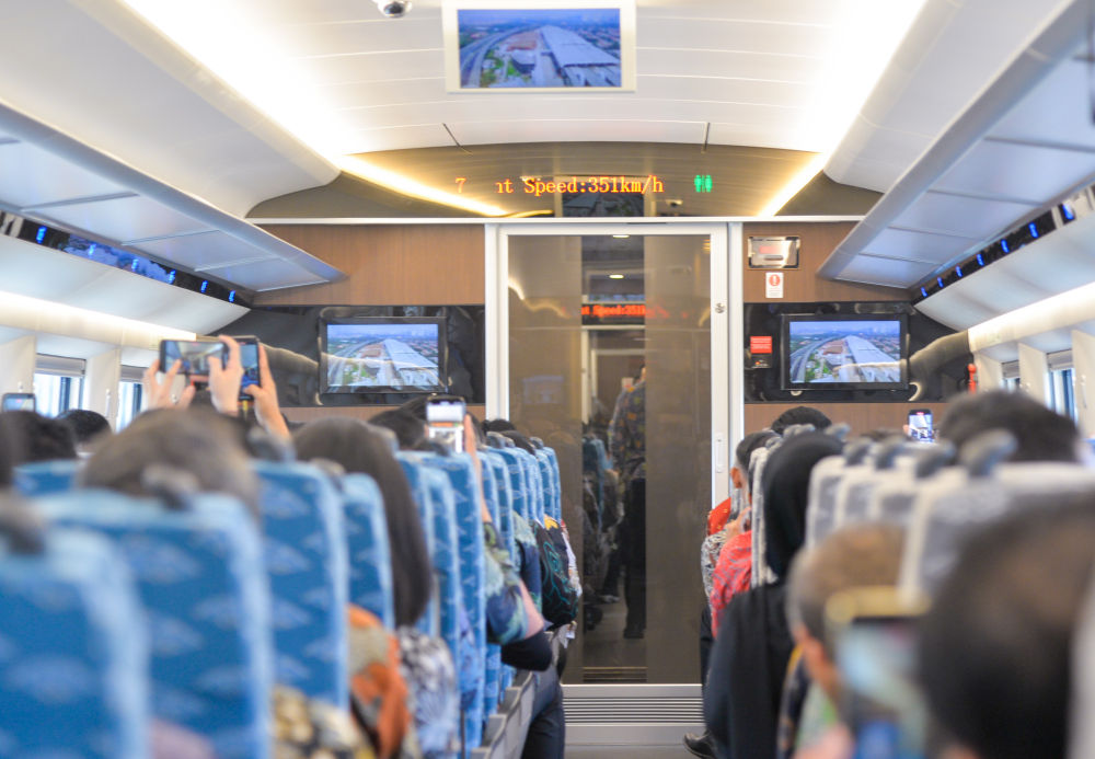 10月17日,乘客在行驶中的雅万高铁高速动车组列车车厢内拍照。