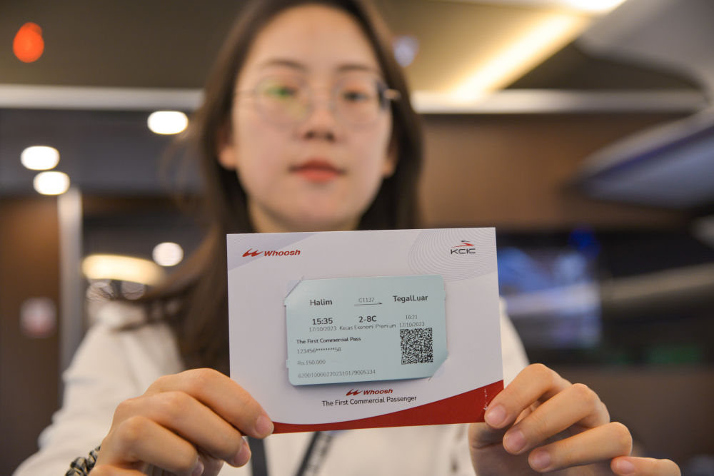 10月17日,乘客在行驶中的雅万高铁高速动车组列车车厢内展示纪念车票。
