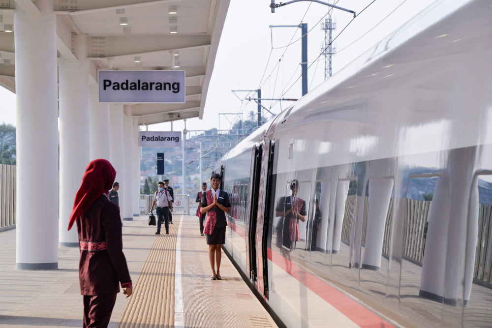 10月17日,雅万高铁高速动车组列车停靠在印度尼西亚帕达拉朗站台上。