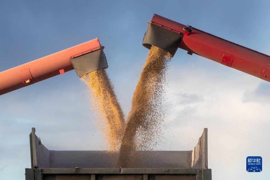 10月19日,在齐齐哈尔市甘南县中兴乡绿化村的一处大豆地,收割机卸下刚刚收获的大豆。