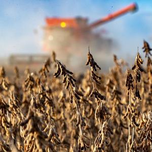 10月19日,收割机在齐齐哈尔市甘南县中兴乡绿化村的一处大豆地收获大豆(无人机照片)。
