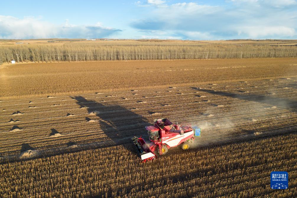 10月19日,收割机在齐齐哈尔市甘南县中兴乡绿化村的一处大豆地收获大豆(无人机照片)。