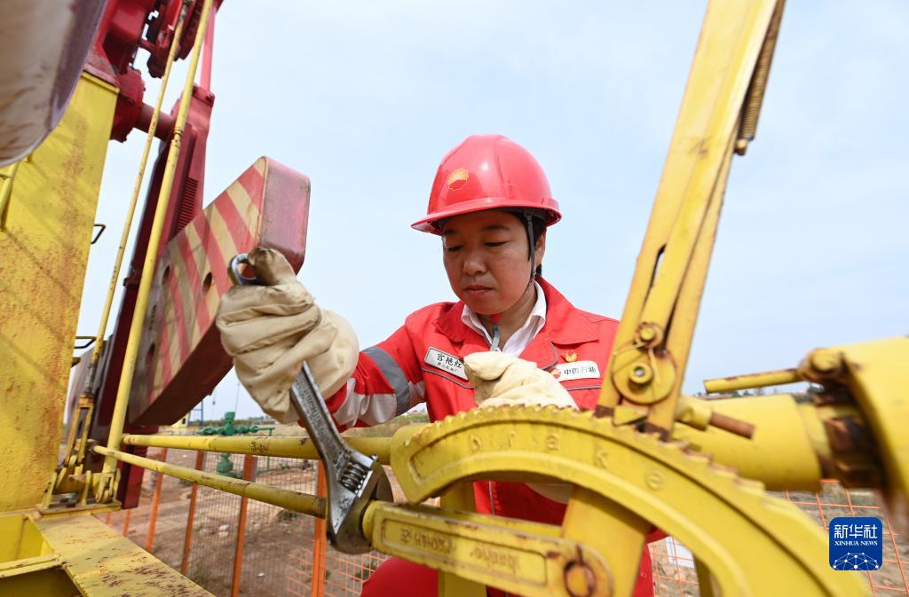 10月18日,宫艳红在中国石油大港油田第三采油厂第六采油作业区对抽油设备进行维护保养。
