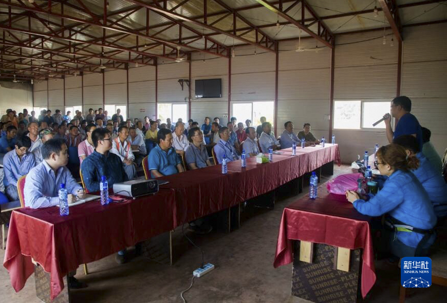 2014年8月31日,第24批援几内亚医疗队在凯乐塔水电站建设工地为员工培训埃博拉防护知识。新华社发(国家卫生健康委供图)