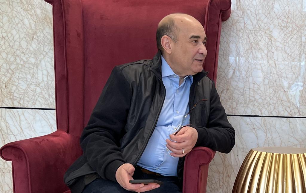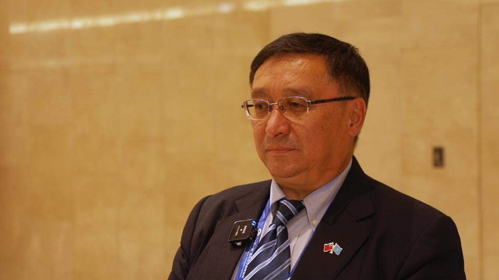 《哈萨克斯坦实业报》总编辑谢里克·科尔茹姆巴耶夫在第三届“一带一路”国际合作高峰论坛现场接受记者采访。