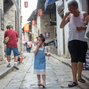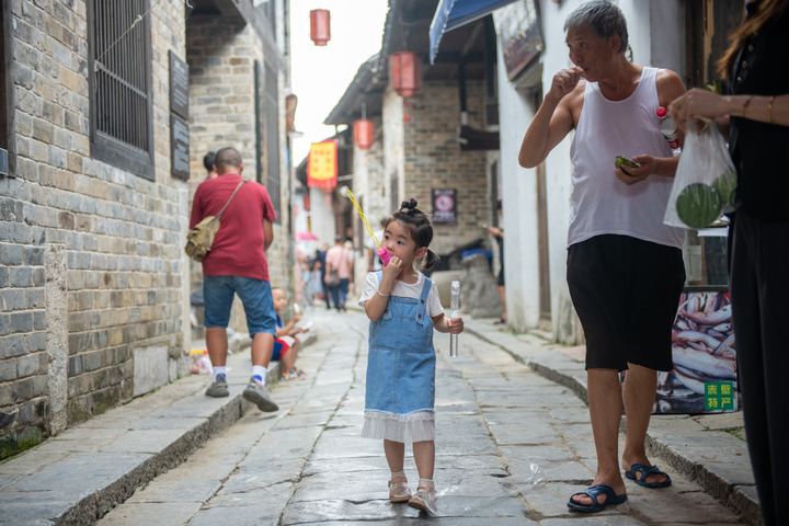 9月9日,游客在湖北赤壁羊楼洞明清石板街参观游览。新华社发(杜子璇摄)