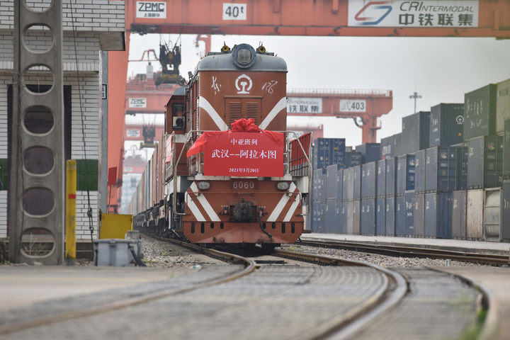 2021年5月20日,开往哈萨克斯坦阿拉木图的班列在武汉吴家山站整装待发。这是吴家山站开出的第一列中亚班列,也是武汉首次开行至哈萨克斯坦的中亚班列。新华社发(彭琦摄)