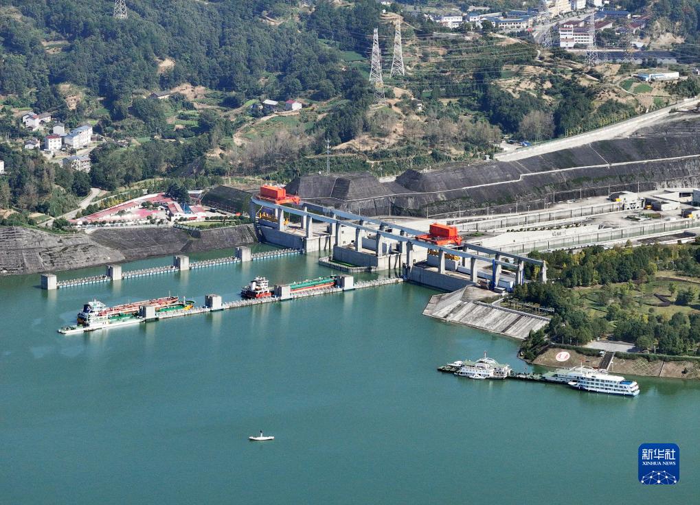 10月20日,船舶停靠在水位上涨后的三峡双线五级船闸前等待过闸(无人机照片)。新华社发(王辉富摄)