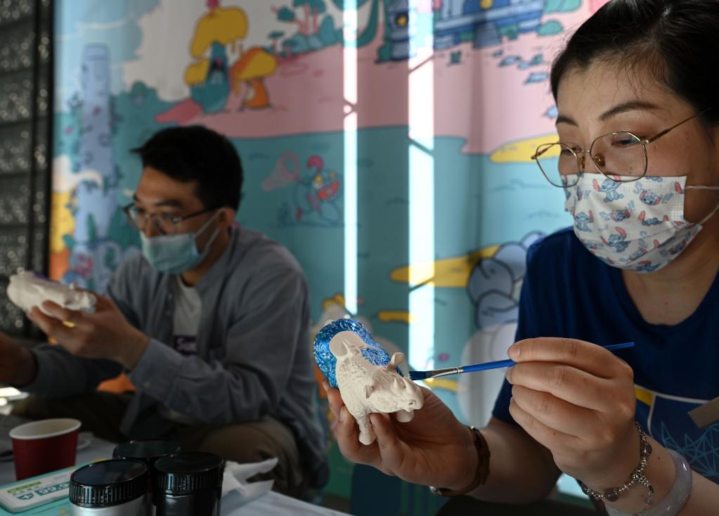 2023年5月18日,市民在犀牛尊素胚上涂色。犀牛尊以国博馆藏重器“错金银云纹青铜犀尊”为原型。 新华社记者 金良快 摄