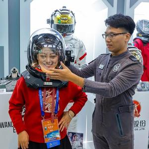 10月18日,在2023成都世界科幻大会主题展览上,科幻迷试戴根据电影《流浪地球》内容1比1制作的可穿戴地表服头盔。新华社记者 沈伯韩 摄