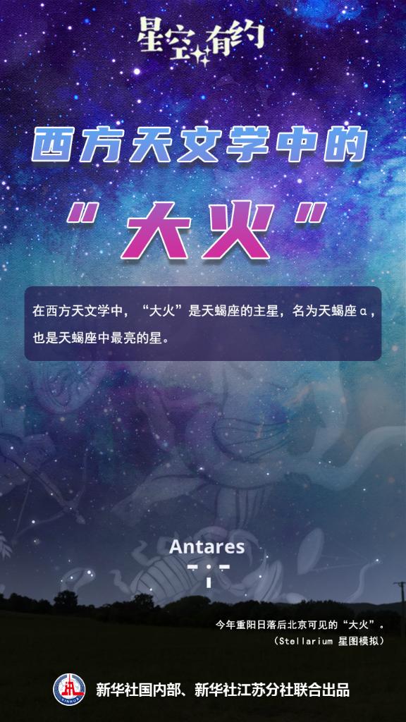 今年重阳节这天,我国绝大部分地区的人们在日落后短暂的一段时间内,还可在西南方向的天空看见“大火”,但地平高度已经不足10度,可观测时间不到一小时。而到11月初,很多地方已完全看不到“大火”。