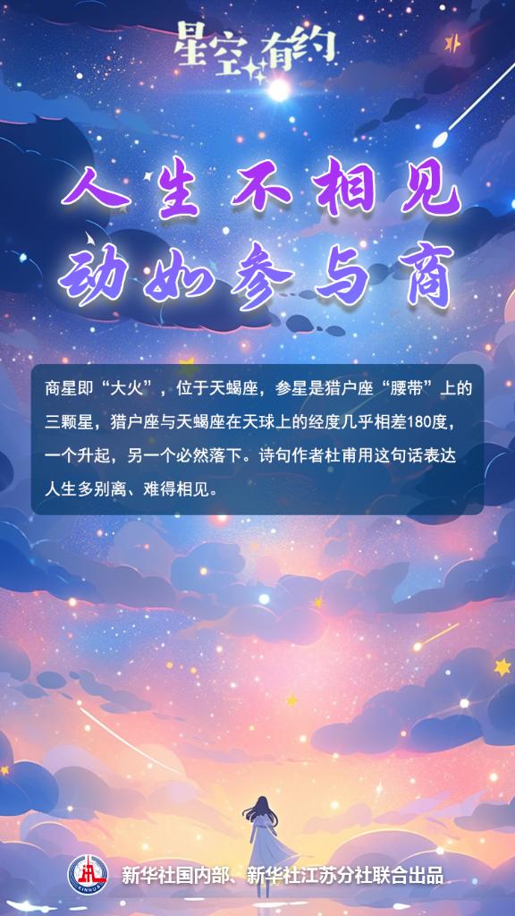 除了心宿二、“大火”、天蝎座α,这颗星还有别名“商星”。杜甫有诗云:“人生不相见,动如参与商。”这句话的意思是人生多别离、难得相见,好比此起彼落的参星与商星。王科超说,古人对星空的观察细致入微。参星是猎户座“腰带”上的三颗星,它们与商星所属的天蝎座在天球上的经度几乎相差180度,一个升起,另一个必然落下。