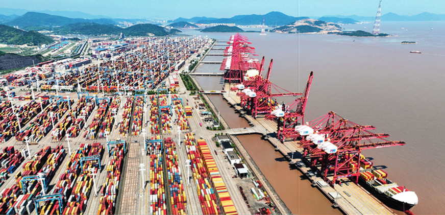 货轮停靠在宁波舟山港穿山港区装卸货物(2023年5月9日摄)。翁忻旸摄/本刊