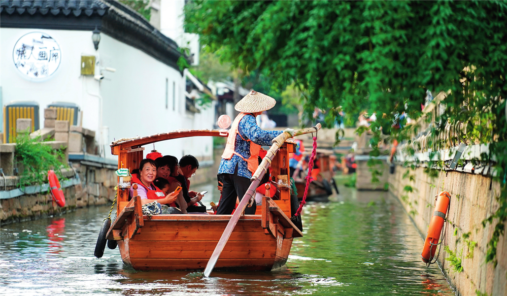 游客乘船在苏州平江历史文化街区休闲游玩(2023年7月3日摄)。李博摄/本刊