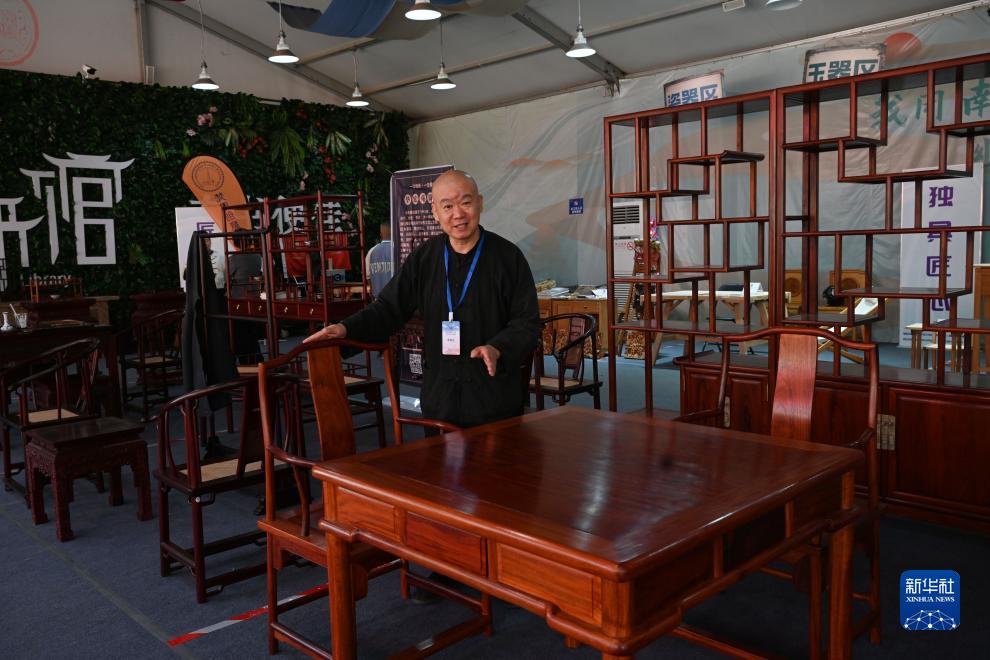 10月21日,手工艺人弓成明在介绍家具。