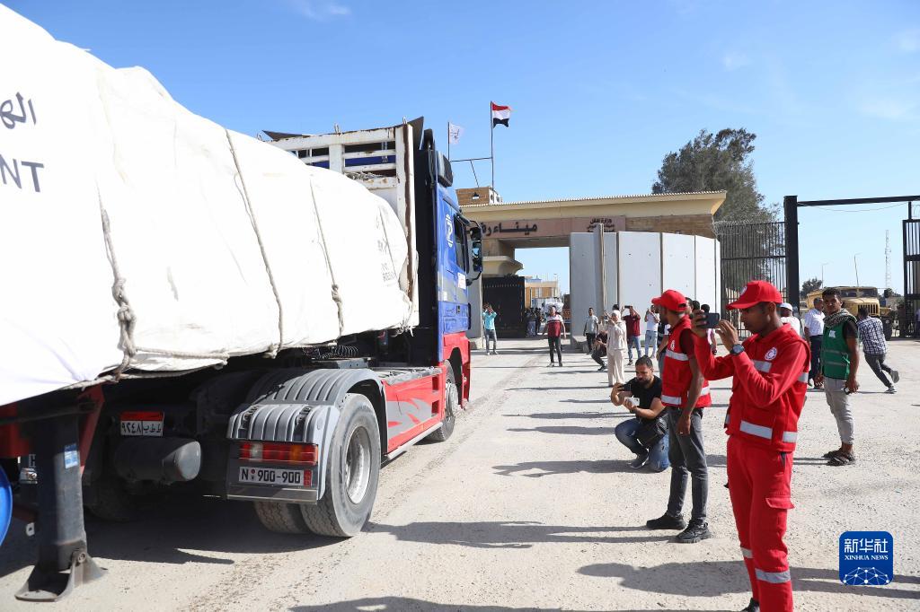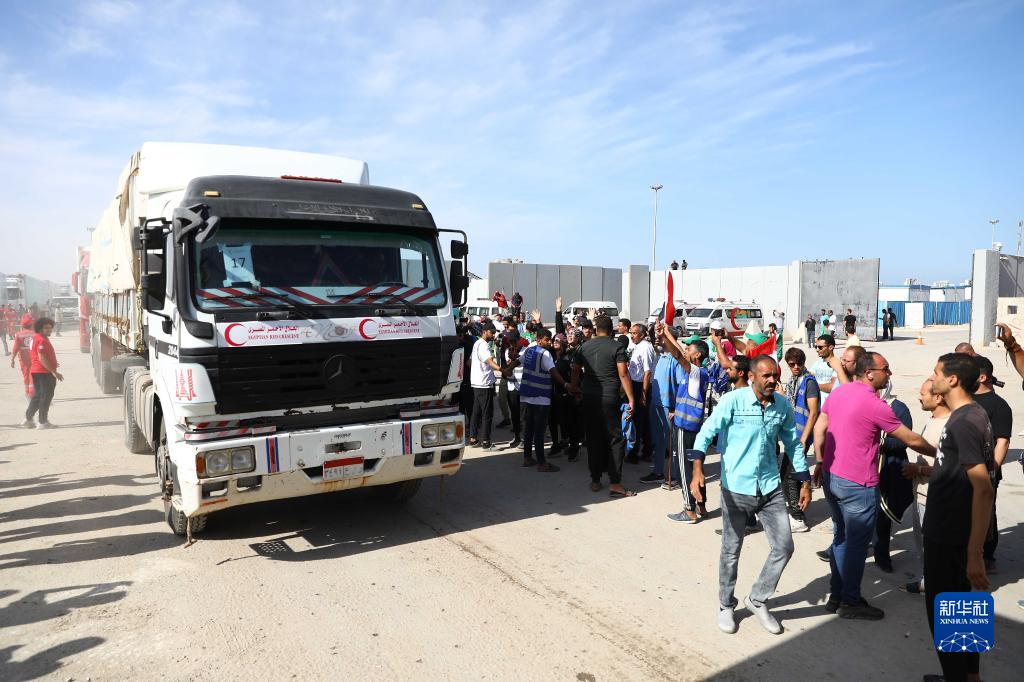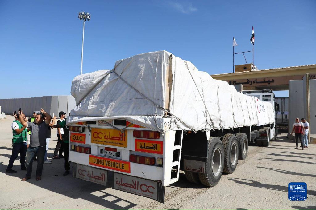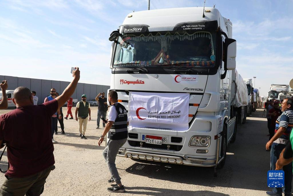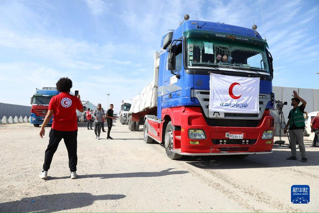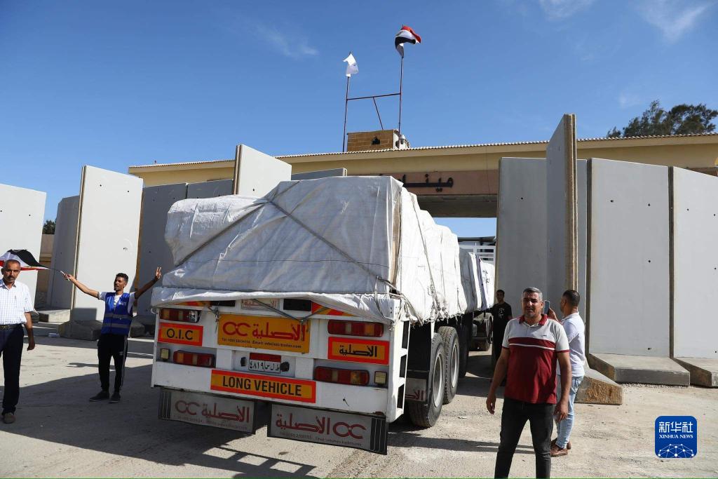 10月21日,在拉法口岸埃及一侧,装载有人道援助物资的货车通过拉法口岸。新华社发(艾哈迈德·戈马摄)
