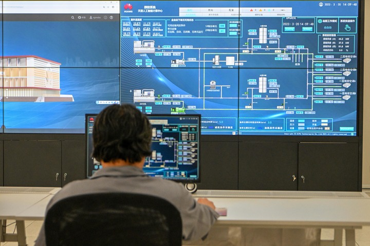 在天津市人工智能计算中心中控室,技术人员在监控设备运行情况。新华社记者 孙凡越 摄