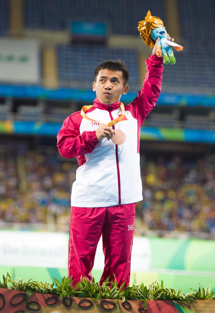 资料图:2016年9月12日中国选手孙鹏祥在里约残奥会男子标枪F40/41级决赛中获得铜牌。 新华社记者 肖艺九 摄