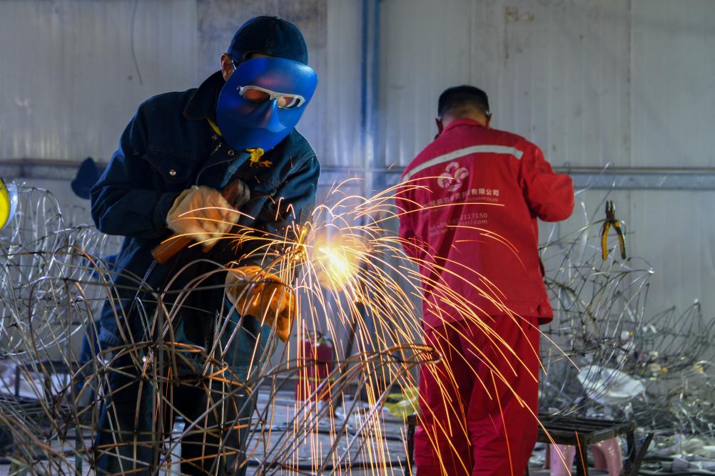 焊工在自贡市大安区某彩灯制作厂赶制彩灯。新华社记者唐文豪 摄