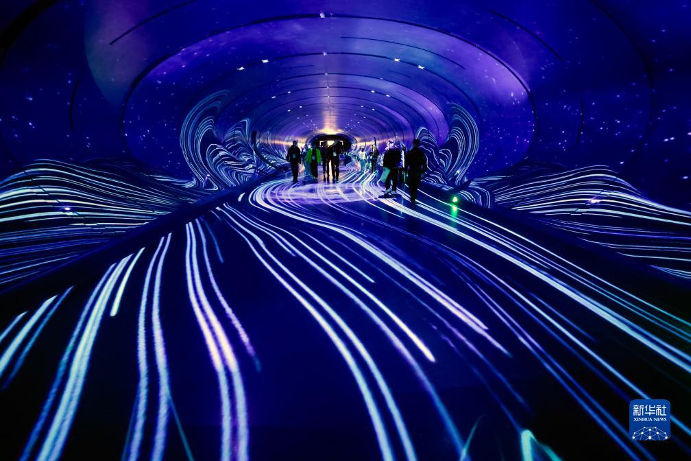 10月18日,在第81届世界科幻大会主场馆——成都科幻馆内,人们走在“时空隧道”内。