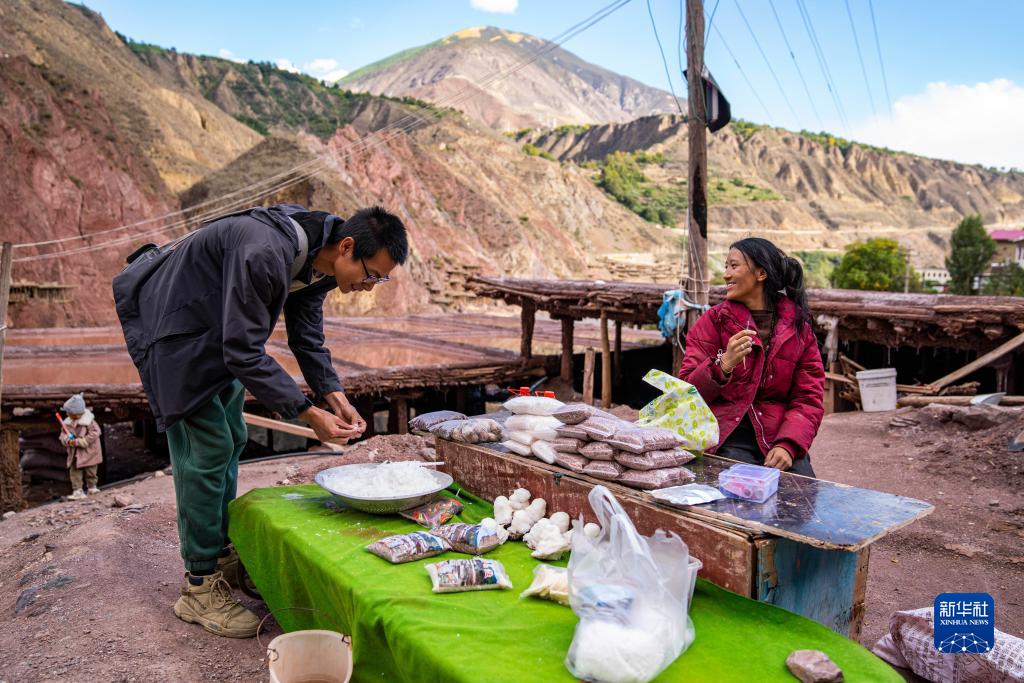 一名村民在西藏昌都市芒康县纳西民族乡的盐田旁向游客推销自家产的盐(10月20日摄)。