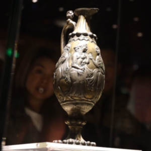 鎏金银壶是波斯王朝贵族所使用的酒具,距今已有1500年历史,是通过丝绸之路流传到我国的中亚风格的稀世珍宝。凸钉玻璃碗属于波斯萨珊王朝玻璃制品。