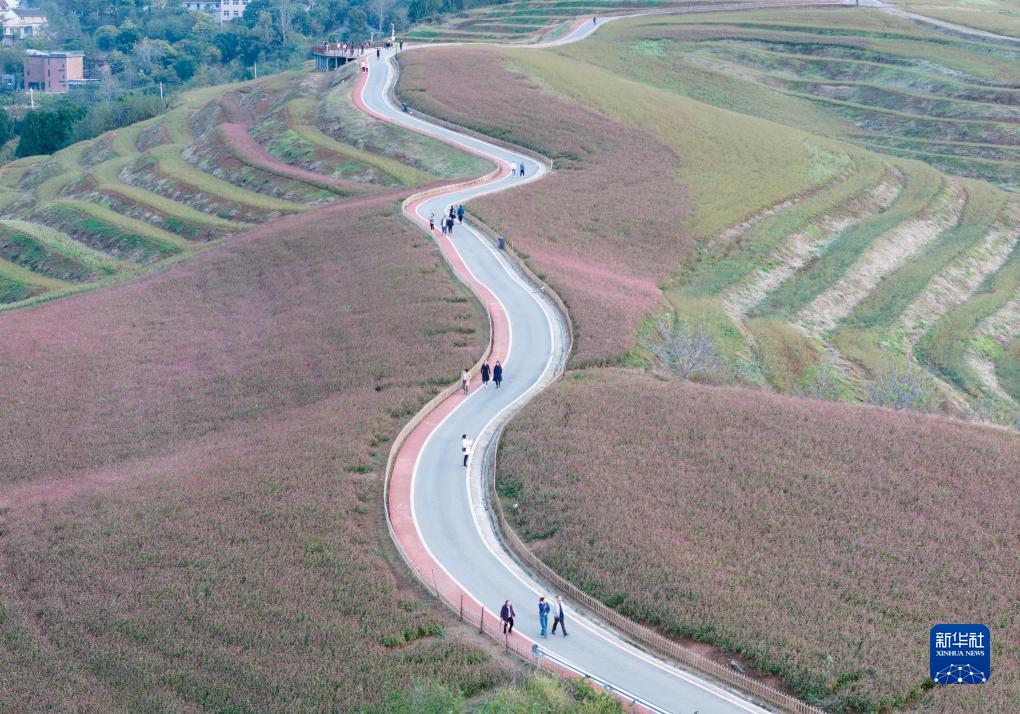 陕西省西安市蓝田县九间房镇“荞麦花海”景区景色(无人机照片,10月19日摄)。