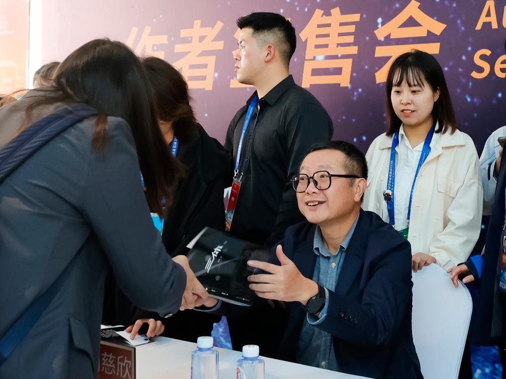 10月20日,刘慈欣(前右)在现场为科幻迷签名。新华社记者 沈伯韩 摄