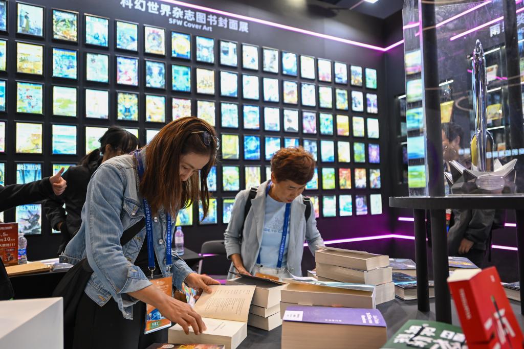 10月18日,观众在2023成都世界科幻大会主题展览上挑选科幻书籍。新华社记者 胥冰洁 摄