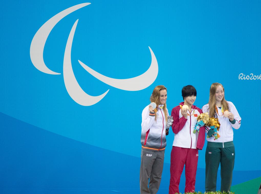 2016年9月15日,里约残奥会,徐佳玲(中)获女子100米蝶泳S9级冠军。新华社记者杨磊摄