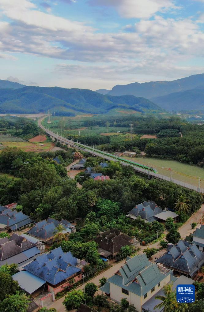 10月18日,在云南省景洪市勐罕镇,中老铁路上的动车从傣族村寨旁驶过(无人机照片)。