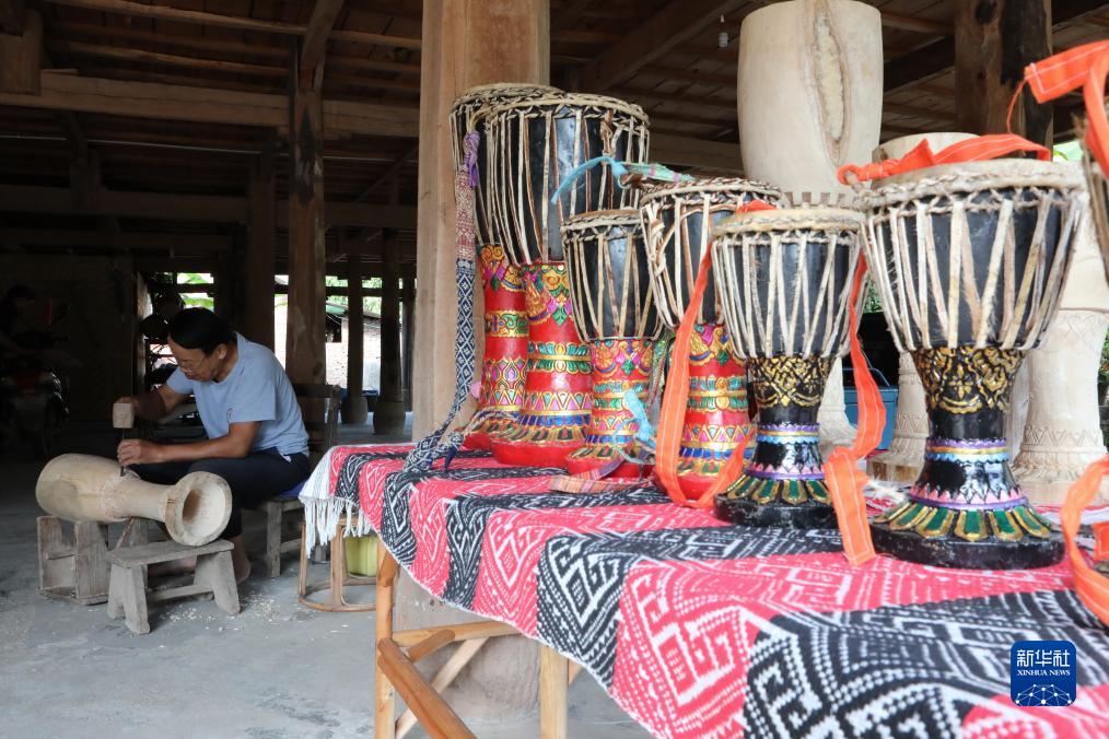 10月18日,云南景洪市勐罕镇曼听村的非遗传承人波应章在制作象脚鼓。他制作的象脚鼓很受游客欢迎。
