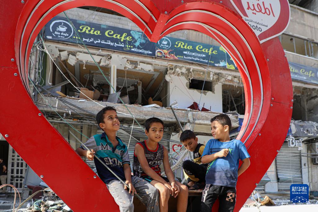 10月22日,在加沙地带南部城市汗尤尼斯,几名儿童坐在一处心型设施上,身后是遭以色列空袭损毁的建筑。
