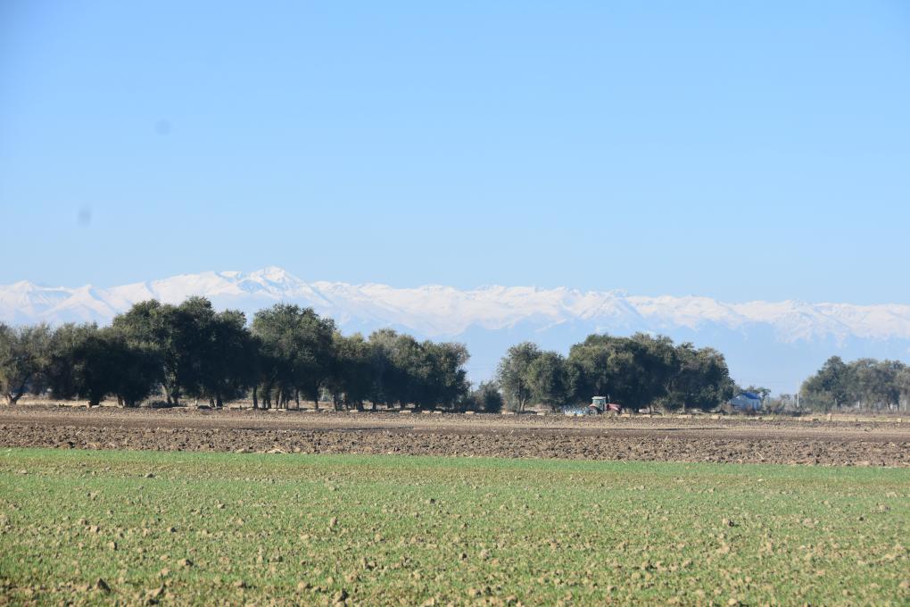 深秋的天山脚下,目之所及,仿佛一幅没有画框的巨幅油画,头顶的天空湛蓝如海,远处的雪峰似白练飞舞。山下各类农机在旷野里轰鸣,农人们在大地上忙碌。