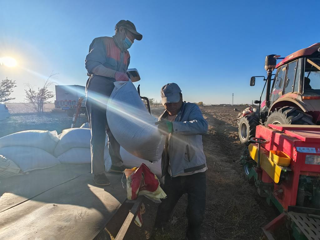 10月17日,新疆昌吉回族自治州奇台县吉布库镇达板河村的农田里,农民正准备播种小麦。新华社记者苟立锋 摄