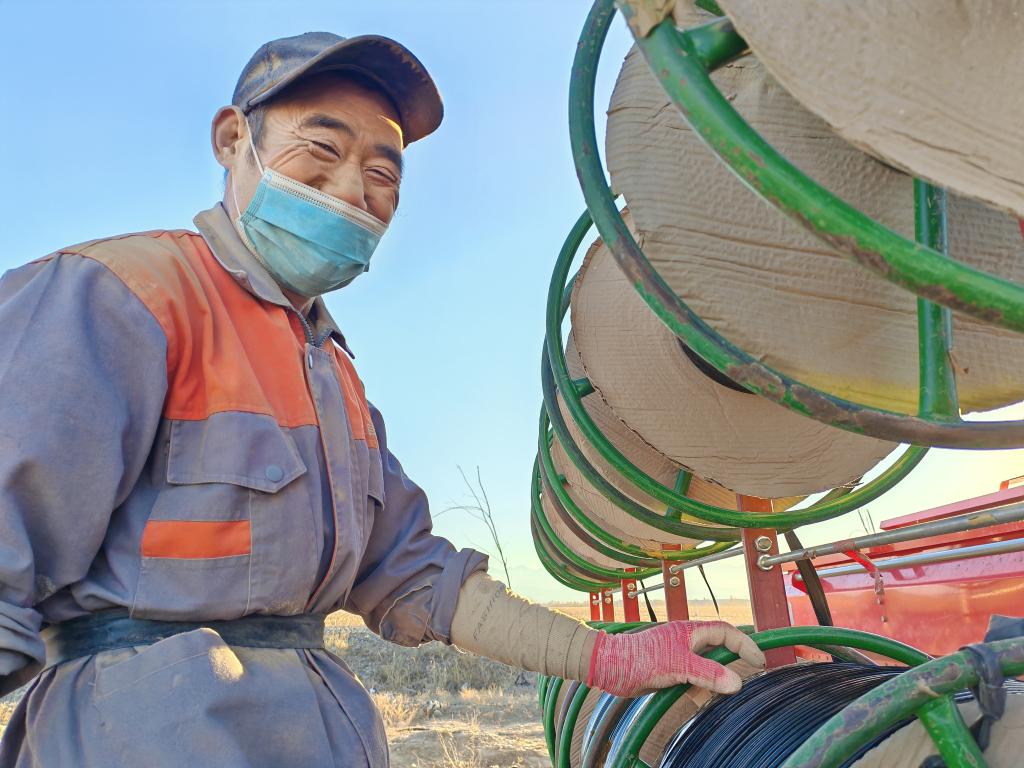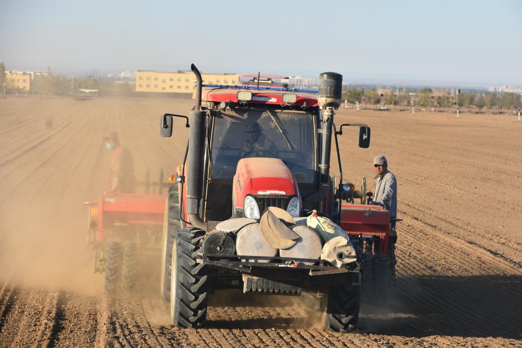除了把化肥、麦种播进土壤,铺设滴灌带也是一道重要工序。搭档赵平、窦刚默契地跟在后方,查看用料消耗和滴灌带铺设情况。