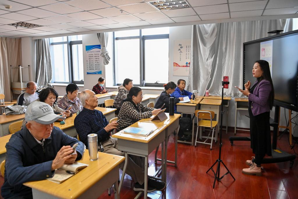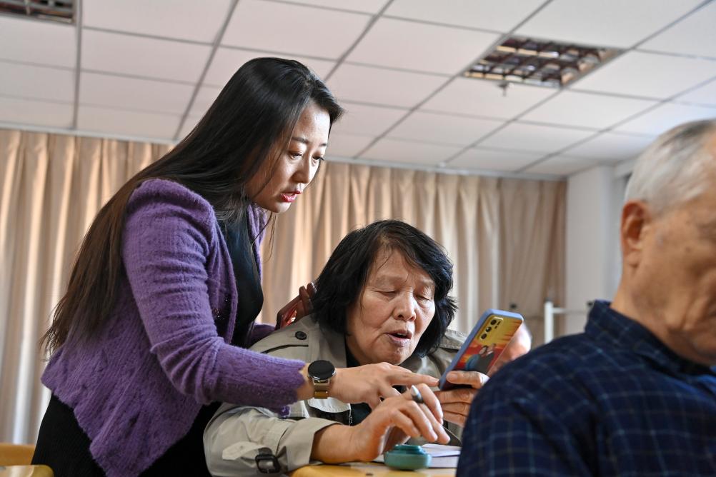 10月19日,在太原开放大学,杨晓琴(右一)为老年学员讲解如何用手机点外卖。新华社记者 杨晨光 摄