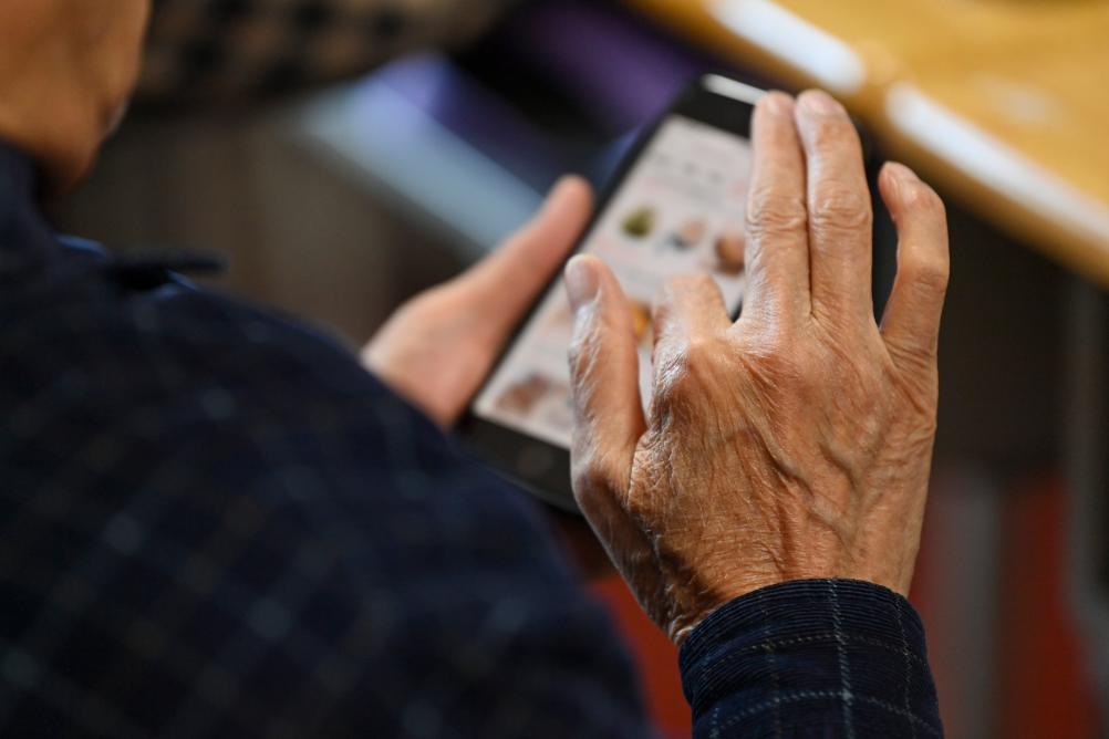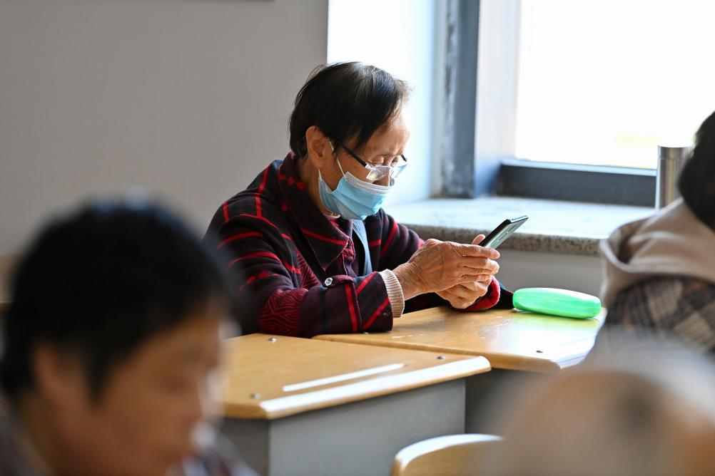 10月19日,在太原开放大学的老年智能手机课上,一名学员尝试用手机点外卖。新华社记者 杨晨光 摄