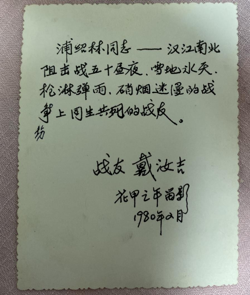 在抗美援朝战争中,父亲参加了第一、二、三、四次战役……特别是在第四次战役的帽落山阻击战中,父亲所在连队坚守帽落山阵地,配合149师447团坚守白云山阵地,英勇顽强,不怕牺牲,与敌殊死搏斗,圆满完成任务,受到了上级表彰。在这场战役中,父亲结识了时任447团3营副营长的戴汝吉伯伯。